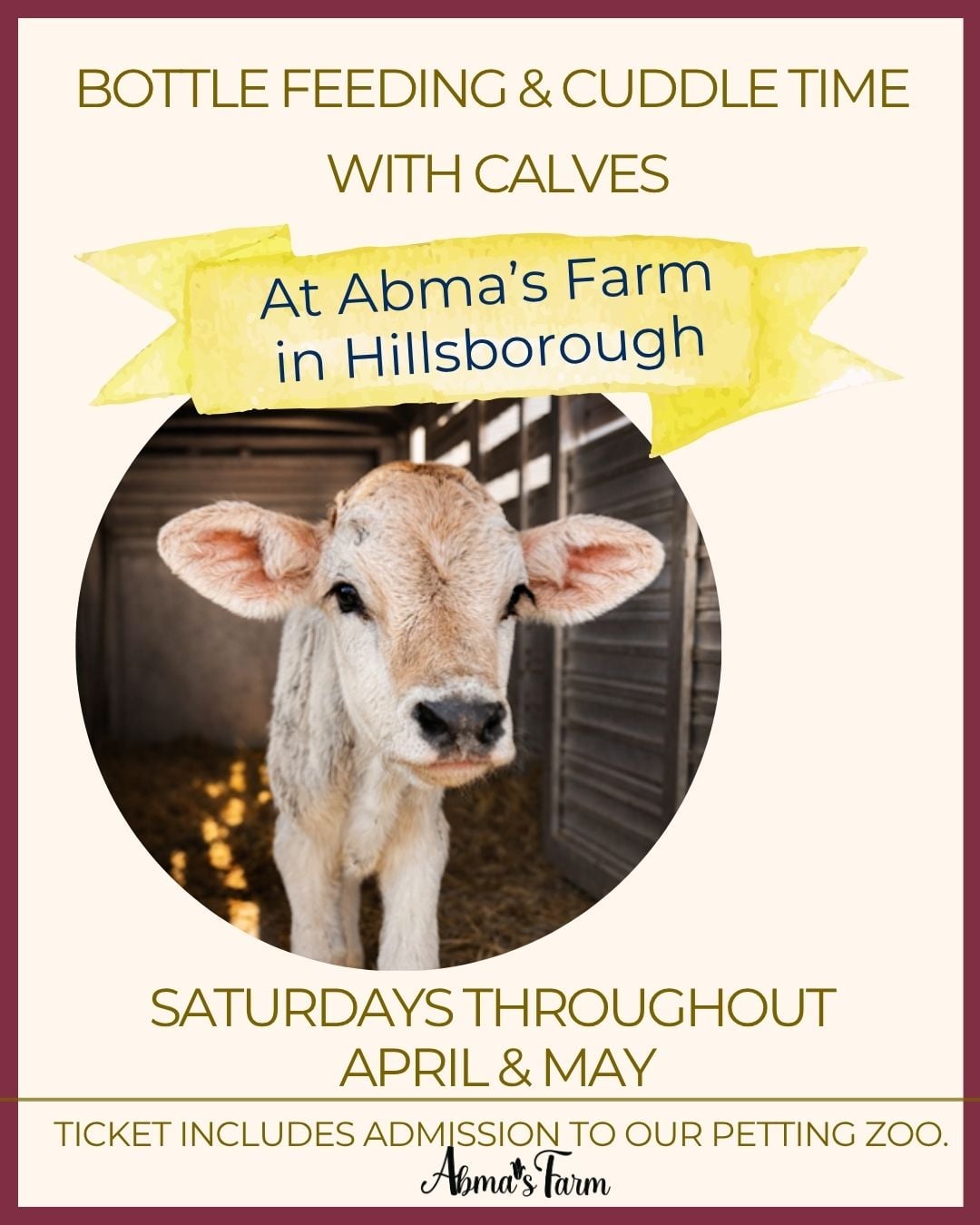 Each session includes hands-on time in the enclosure with a baby calf, plenty of photo opportunities, and a chance to learn about calf care and farm life. Plus, your ticket includes admission to our Petting Zoo, where you’ll receive two animal crackers to feed our other friendly farm animals.