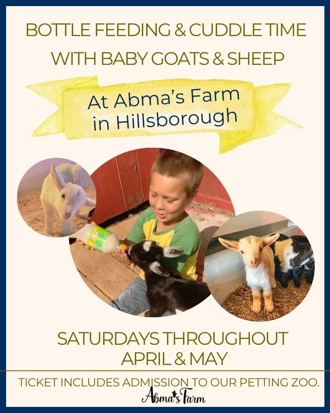 Join us at the farm to feed, cuddle, and play with a baby goat at our Hillsborough location! You will get 30 minutes of up close bonding with our newest arrivals. Your ticket also includes full petting zoo admission to enjoy at your leisure.