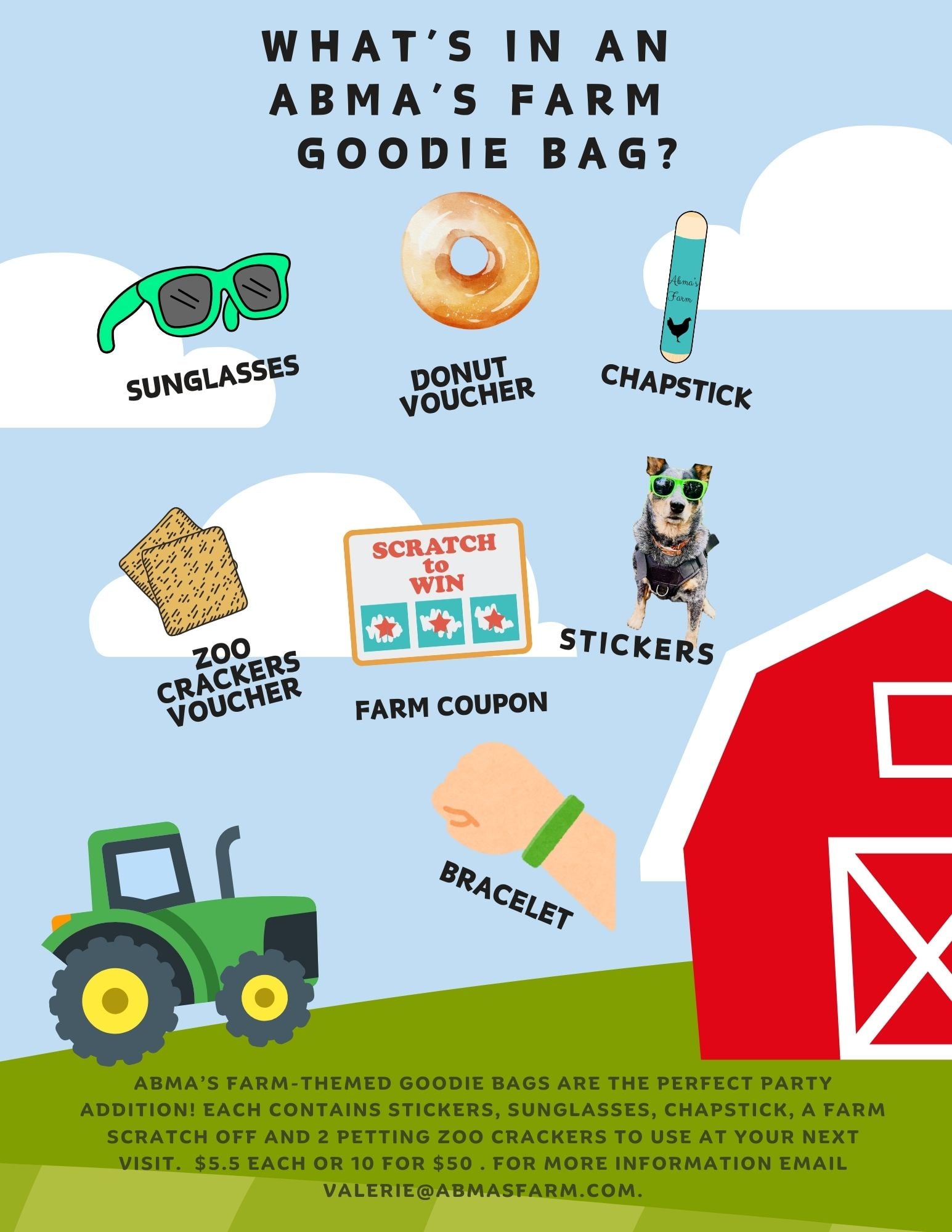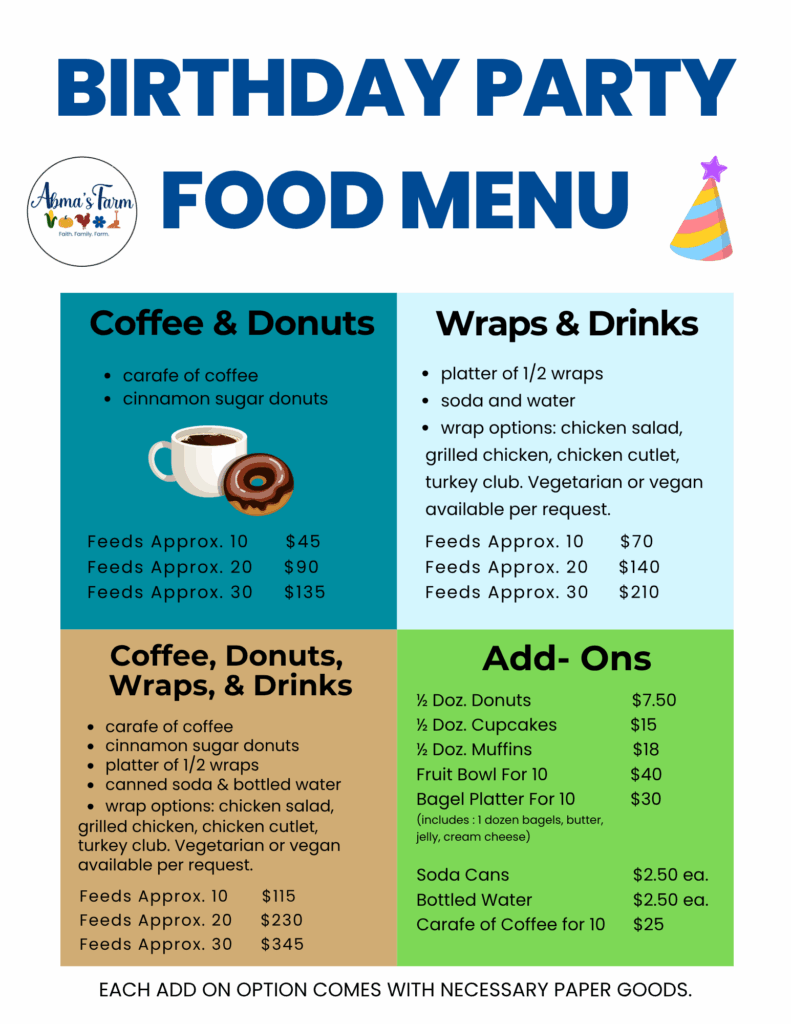 Admission to the Barnyard Petting Zoo is not included. You may add admission for an additional cost, enjoyed before or after the party.